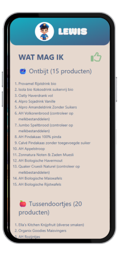 Is de pagina waarin men kan zien wat jij allemaal wel mag hebben. Dat kan ook een lijst van losse producten zijn of specifieke voedsel ingrediënten of bestanddelen. Maar ook een productgroep zoals brood of kaas. Ook hier geldt, hoe specifieker jij dit invult hoe beter de informatie is voor familie, vrienden, kennissen en omstanders of hulpverleners.