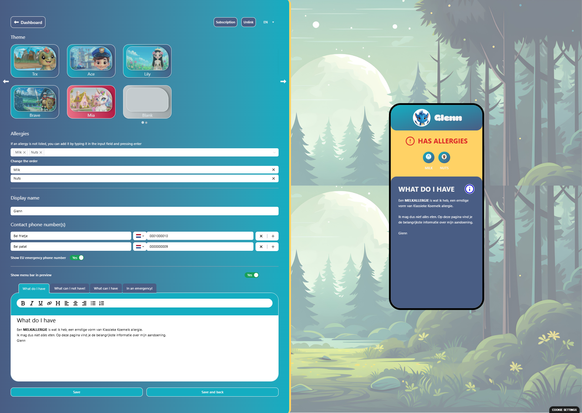 Via de navigatieknoppen bij het tekstveld vul je alle verdere pagina’s in. Wat mag ik niet eten, wat mag ik wel eten en wat is het hulpplan. Het hulpplan vertelt omstanders of hulpverleners wat zij moeten doen als toch misgaat. Denk hierbij aan het gebruik van bijvoorbeeld de EpiPen of het toedienen van specifieke medicatie. Dit kan ook een video of filmpje zijn dat je uploadt.